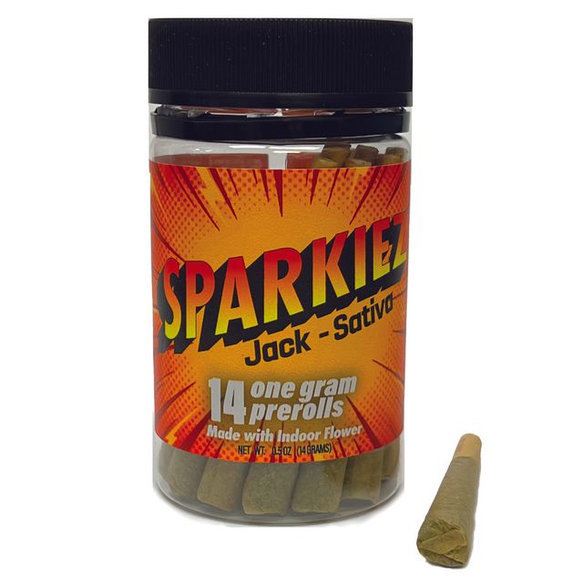 SPARKIEZ JACK SATIVA 14 Pack Pre-rolls: Jack in the jar! Spark up on Sparkiez premium pre-rolls. Sparkiez Jack is the perfect way to get yourself off and running to wherever that may be. Lemony, piney, earthy, and frosty, this sativa dominant strain is full of energy to help you feel focused, motivated and uplifted for any occasion. We take 14 grams (½ Ounce) of beautiful indoor flower, no trim, no shake, and roll it into 14 ready to spark pre-rolls. Ready. Set. It’s Sparkiez time! Each pre-roll contains 1G of flower. (License# CDPH10004780)