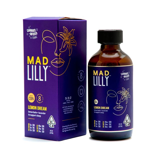 Restful nights make brighter mornings with Mad Lilly™ Lemon Dream Tonic. Melt into a tasteful nightly routine with lightly sweetened lemon juice, low-dose cannabinoids and hints of lemon balm and sleepy lavender. The 5:3:2 ratio of CBN,THC and CBD creates an optimal blend of cannabinoids for full-body relaxation. 5mg CBN, 3mg THC and 2mg CBD per serving. 8 servings per bottle.