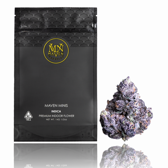 Prizm is a brilliant Indica-dominant cross of Opal and Permanent Marker #12, with shimmering spade-shaped buds. Opening the jar reveals a clean, astringent scent that evolves into pine needles and citrus candy. A floral medley dances on the tastebuds, leading to a sharp, lemon-diesel smoke that dazzles the senses. This vivid spectrum of flavors mirrors its sedative qualities, melting away stress and revealing the hidden beauty in everyday life. Whether you are an experienced connoisseur or a novice, Maven Minis offer the perfect balance of quantity and quality, delivering the same high caliber experience as our full-sized flower, but in a convenient and travel-friendly package. Weight: 1/2 oz. (C11-0000742-LIC)