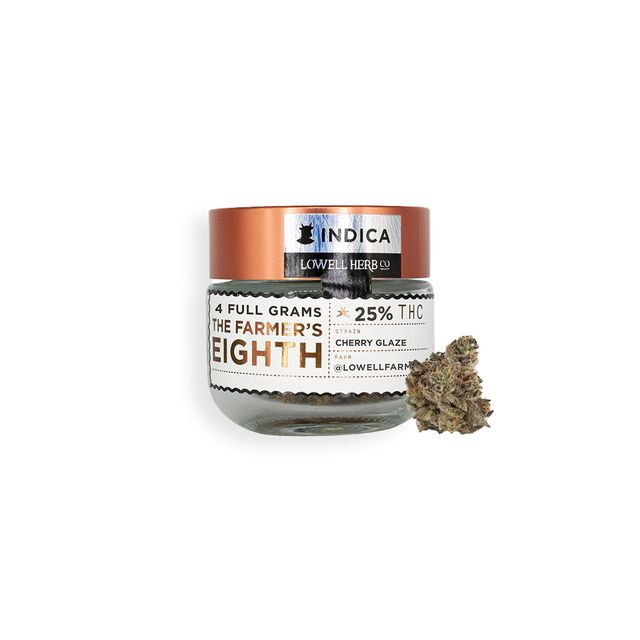 Not unlike biting into a cherry, your palate is met with a sweet and tart first taste. The exhale exhibits creaminess as smooth as silk — the ideal balance. Cherry Glaze stimulates the mind with a serene and tranquil high. With Grand Daddy Purple in its lineage, you can anticipate the repose GDP is known for. This strain is ideal to take the edge off, elevate your mood and reduce stress. It introduces a pleasant, subtle, cerebral stimulation. A choice decision for a rainy day or a much-needed reset. Sometimes, a little extra can go a long way. That’s why we sweat the smallest details, from cultivation to packaging, to ensure we’re always giving you a little more. And now, when you purchase a Lowell Farmer's Eighth, you get a little extra, every time. Weight: ⅛ oz. (License No. C11-000816-LIC)