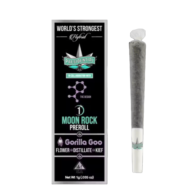 Elevate your weekend with Presidential's 1g Gorilla Goo Moonrock Infused Pre-Roll. It combines top-shelf organic flower from the Gorilla Glue strain, premium THC distillate, and high-quality kief. Rolled in natural unbleached hemp paper with a chlorine-free filter for smooth hits. These pre-rolls never compromise on quality, infused with premium distillate and kief. Recommended for a good time or high tolerance. Experience the moon and back with Presidential's renowned Moonrock Prerolls.