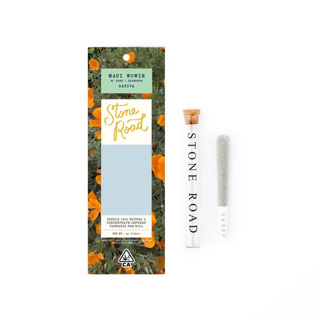 Maui Wowie is a sativa-dominant strain that is energizing, euphoria-inducing, and uplifting. Apart from its effects, Maui Wowie is known for its pungent tropical flavor profile. This varietal was infused with both ice water hash and THCa diamonds for an added flavor and potency kick. At Stone Road we grow our small-batch, all-natural flower in the most sustainable way possible, using only solar power and regenerative water practices. Each of our whole flower joints is then hand-rolled in French papers and twice lab tested for purity and potency, resulting in the healthiest and happiest bud in California. Contains one 1g preroll. Weight: 1g. (License No. C11-0000339-LIC)