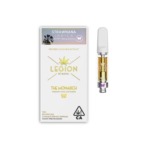 LEGIONS’ Strawnana (Bubblegum X Banana Kush) is fruit-forward and oh so good with notes of tropical fruit, bananas, and strawberries combined with earthy undertones. This indica is calming and soothing making it excellent for taking the edge off without leaving you drooling on yourself. Be wary; the flavor of this one will keep you coming back for more and can lead to overindulgence. LEGION is committed to donating a portion of their Monarch Cartridge sales to restoring Monarch Butterfly habitat in California. Let's save the Monarch together! Compatible with USB Universal Battery, sold separately on Eaze. Weight: 1g. (License No. CDPH-10002733)